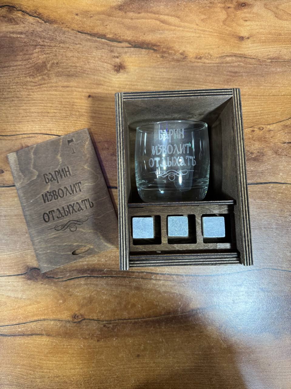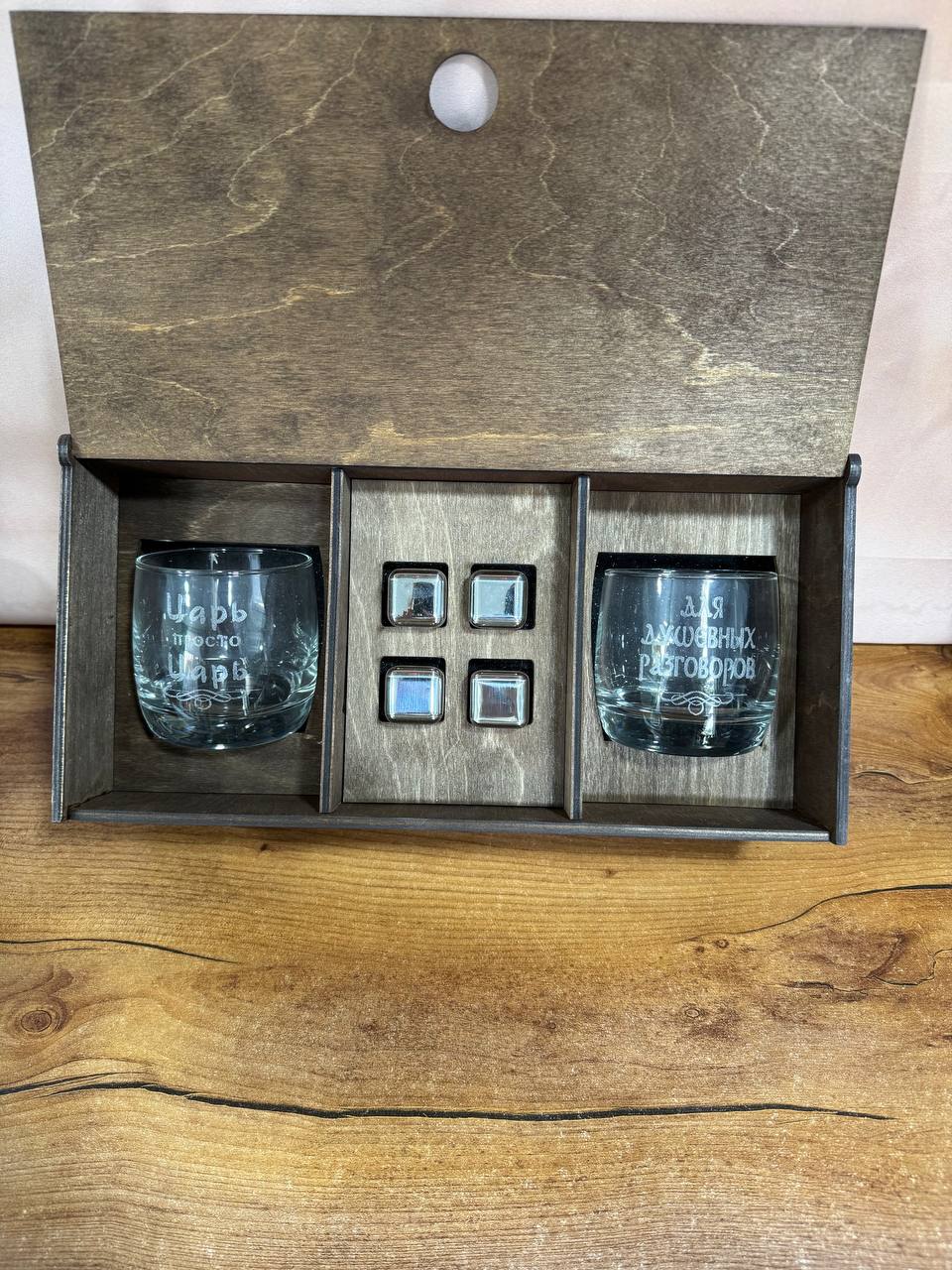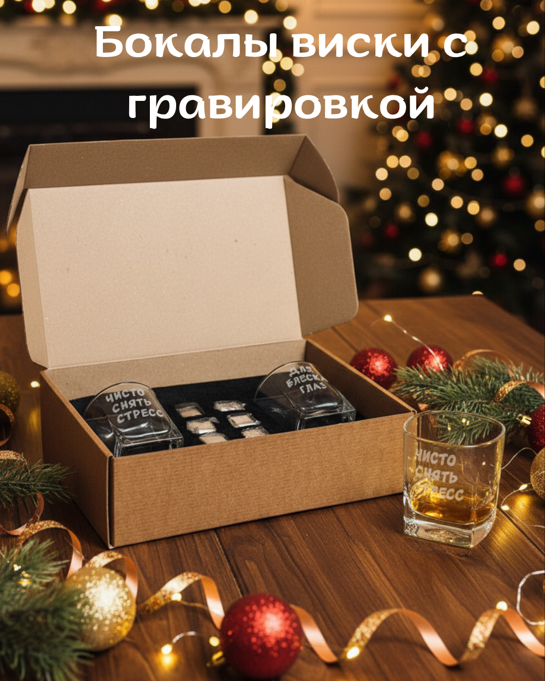 Возможны варианты заказа на два бокала виски или же на один. Вы можете дать свой вариант текста на коробку и на бокал