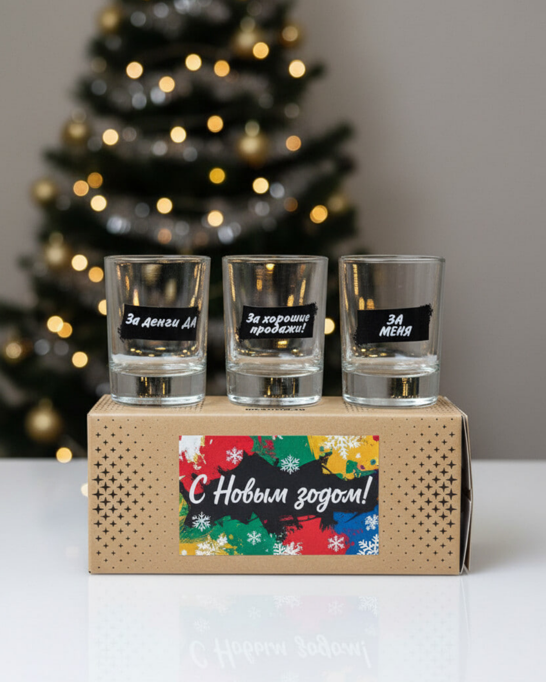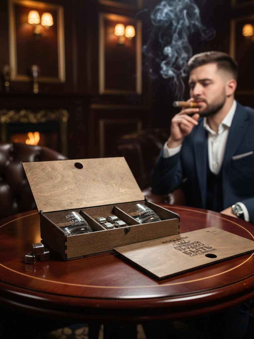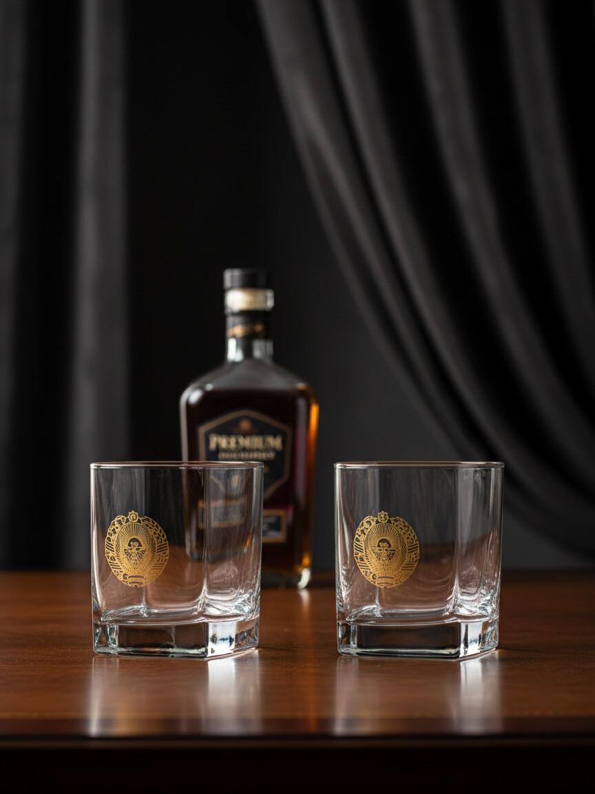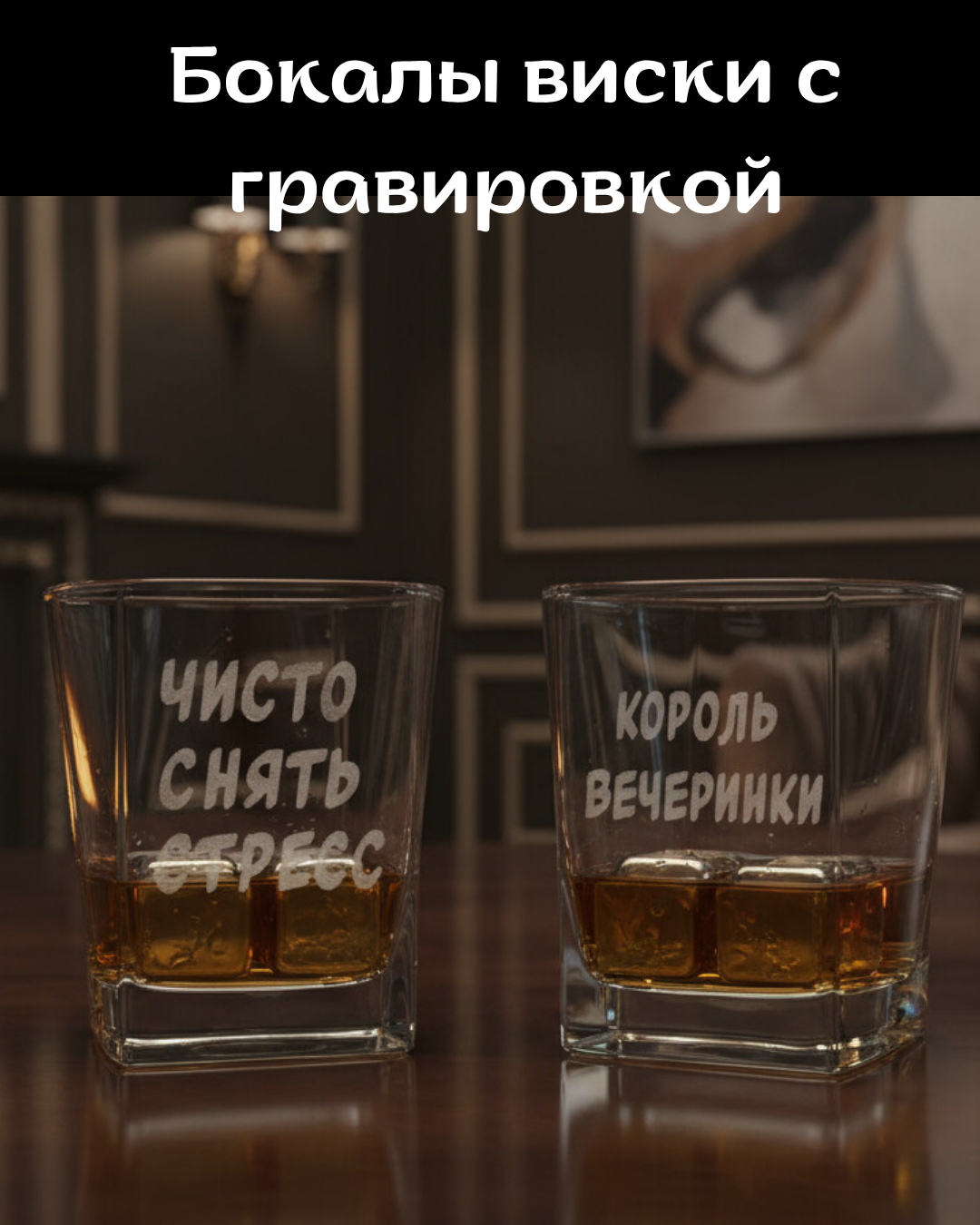 Возможны варианты заказа на два бокала виски или же на один. Вы можете дать свой вариант текста на коробку и на бокал